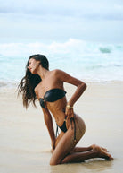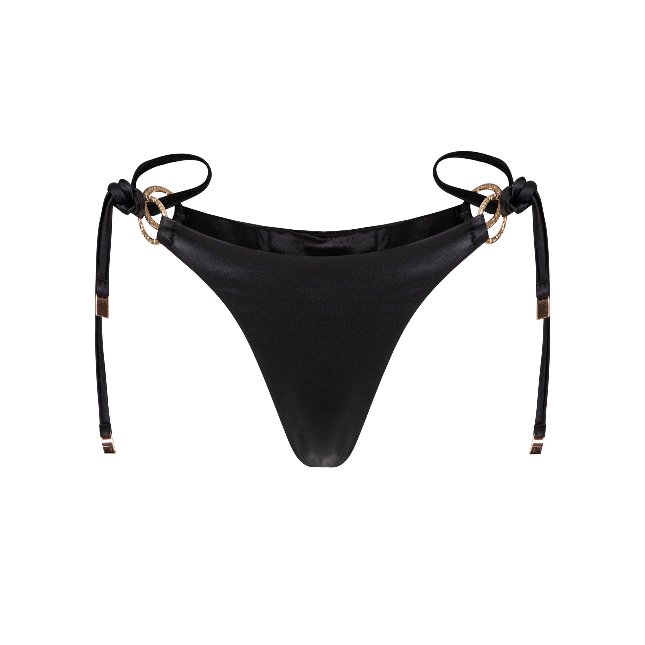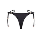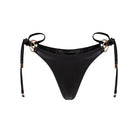 Dół bikini z wiązaniami po bokach, wykonany z włoskiej tkaniny najwyższej jakości i ozdobiony elegancką złotą okuciami.